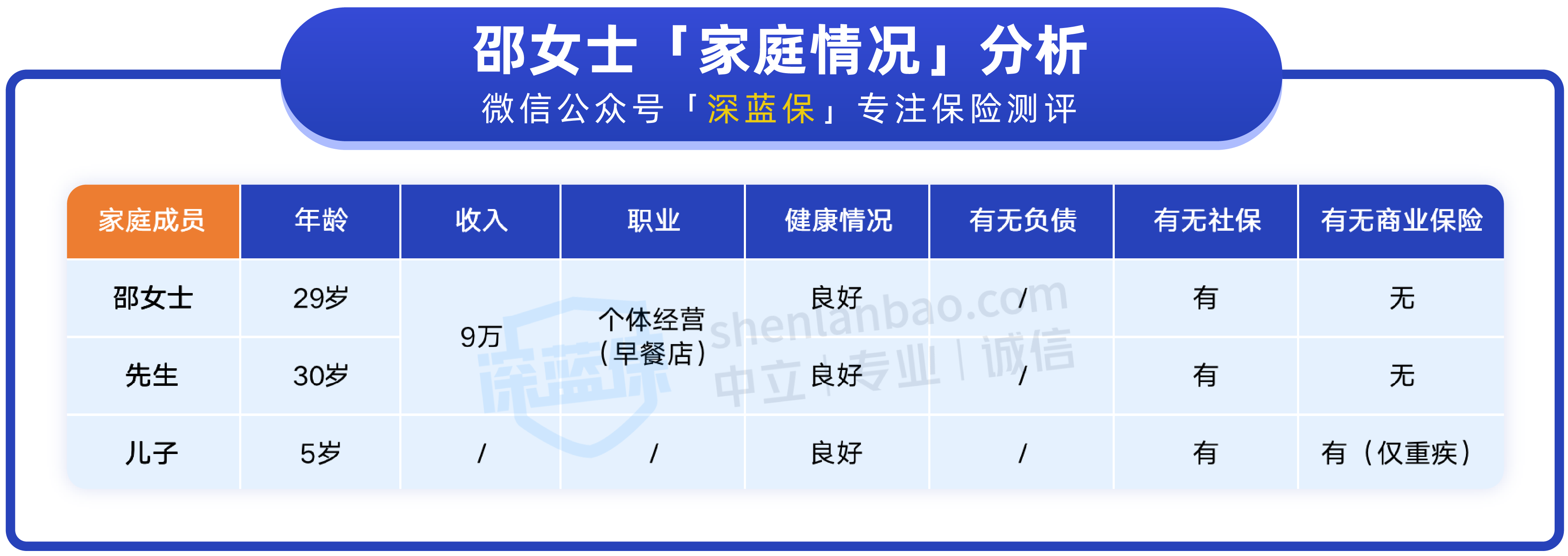邵女士和先生一起开早餐店,年收入大概在 9 万左右,孩子刚出生时就配置了返还型保险,但是只保重疾,没有 医疗险 和 意外险 的保障。