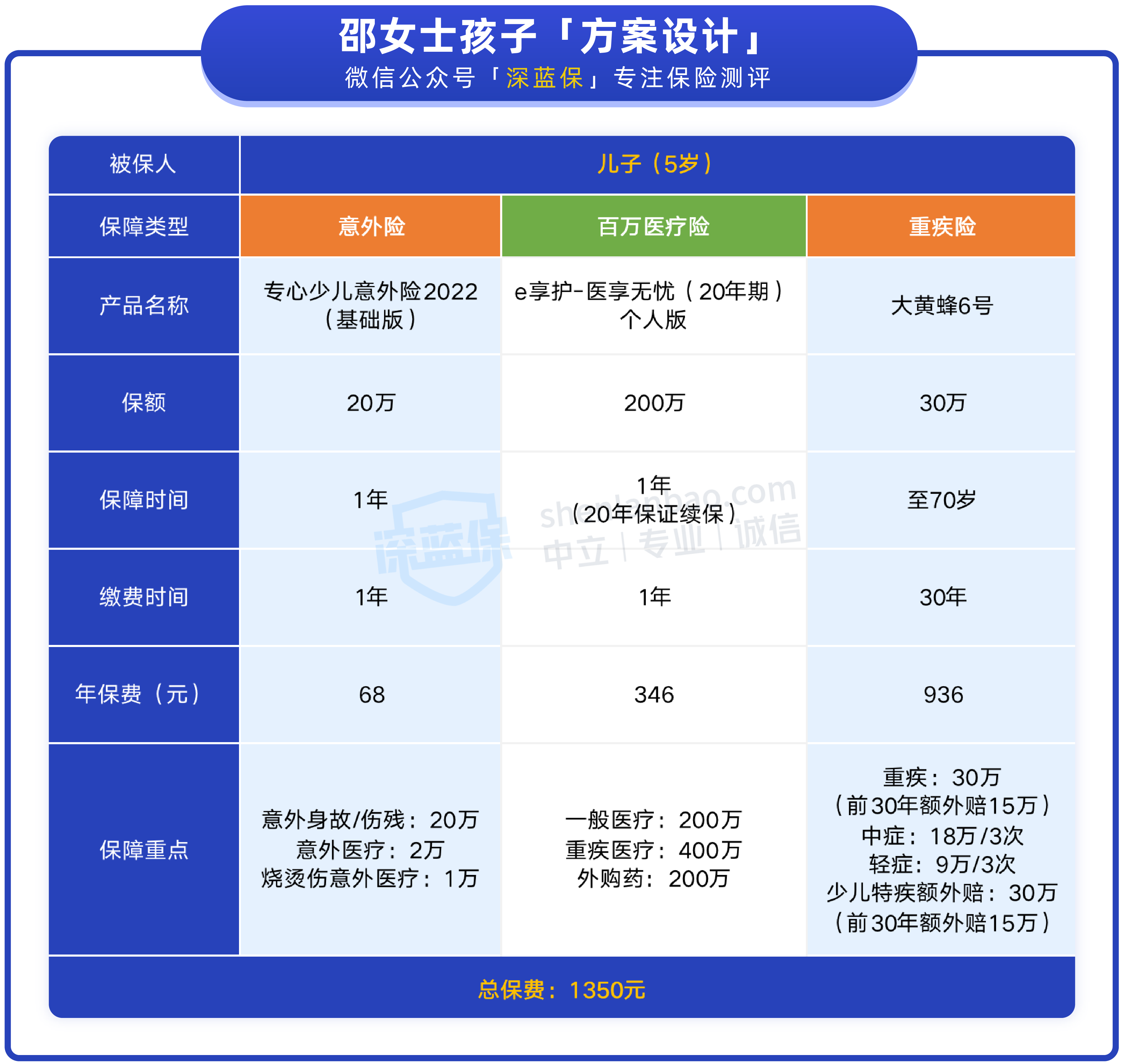 综合来看,我们给孩子优化的方案保费是 1350 元,保障上更加全面了,邵女士对优化后的方案也很满意。