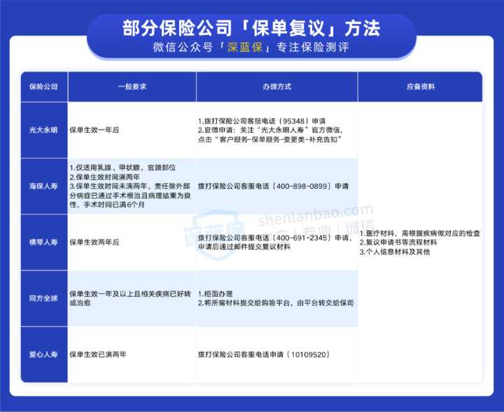 可以看到,这些保险公司大多要求保单满 1~2 年后才能申请再次核保,且不同保险公司,办理的方式也不太一样。