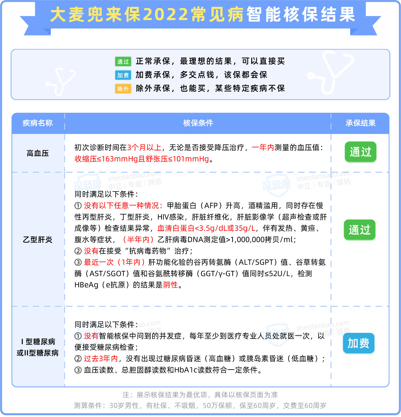 大麦兜来保 2022 支持智能核保,我们也走了核保流程,整理出一些常见疾病的智能核保条件及结论。