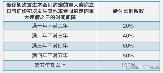 而达尔文6号,则根据两次重疾之间的发生间隔,赔付不同比例的保额,最低20%保额,最高100%保额。