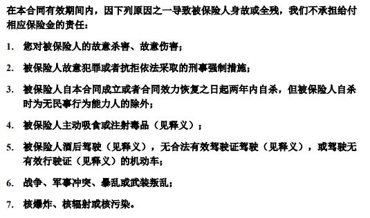 免责条款,也就是保险公司不用赔偿的情形。对我们来说,免责条款当然是越少越好。