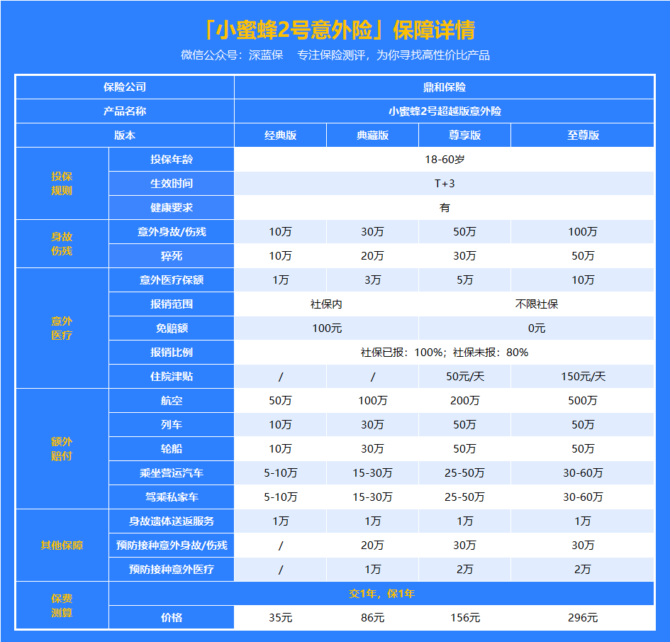 鼎和保险就有一款爆火的意外险——小蜜蜂 2 号超越版,意外医疗最高可报销 10 万,还包含猝死、交通意外等额外赔保障。