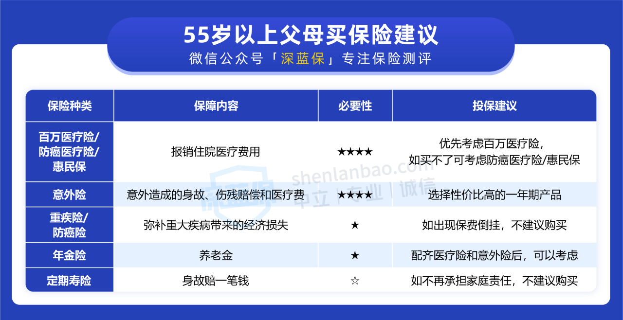55 岁以上父母优先考虑意外险和百万医疗险(如果能买长期医疗险则尽量选择保证续保 20 年的产品),这两个险种能提供较全面的日常保障。