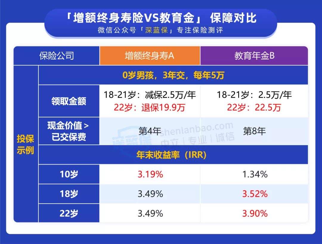 我们分别用一款教育年金和一款养老年金产品,来跟增额终身寿对比一下,看看它们实际的收益差距。