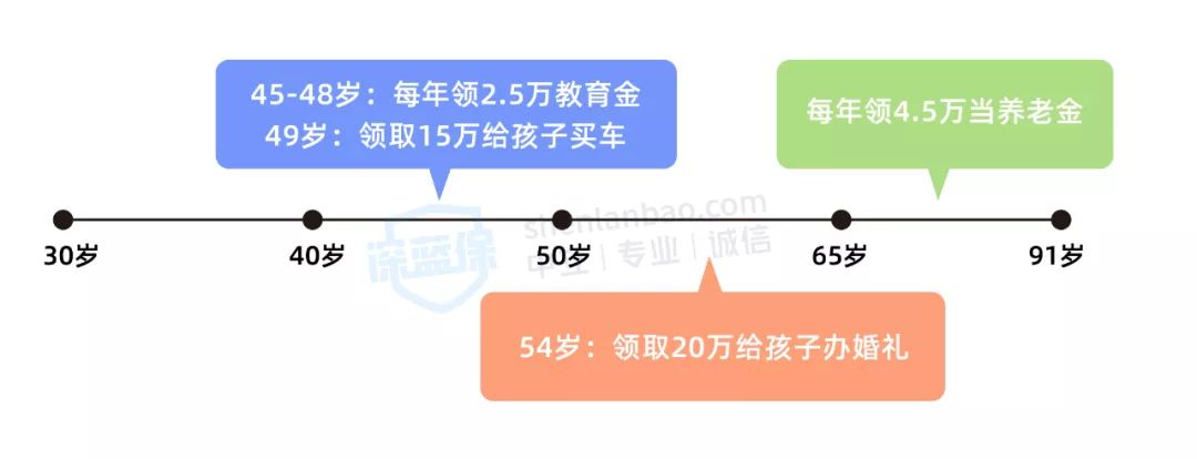 之后,他又通过增额终身寿满足了 3 种不同的用钱需求,包括给孩子买车、操办婚礼以及自己的养老金。