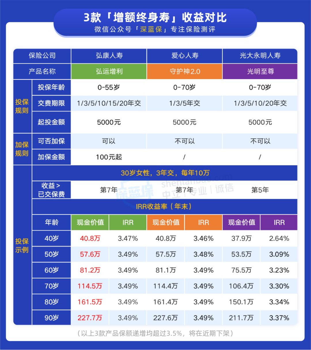 我们把市面上热销的增额终身寿都对比了一遍,筛选出了以下 3 款比较不错的产品。一起来看看它们有什么区别,哪款收益更高: