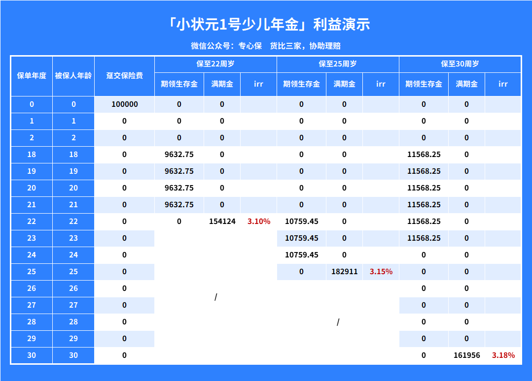 小状元1号少儿年金保障期限多,可选择保至 22、25、30 周岁。