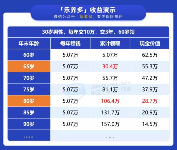 从表格可以看出,如果以 30 岁女性,3 年交,每年交 10 万为例: