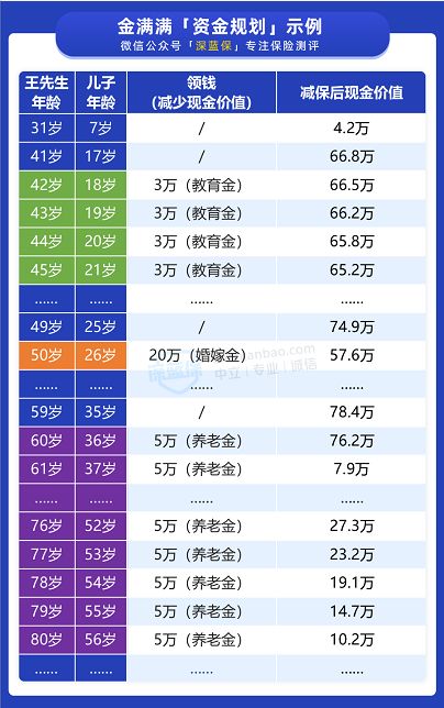 在不同年龄段,王先生都可以根据自己的财务规划,利用金满满的“减保提取”功能灵活取钱出来使用。
