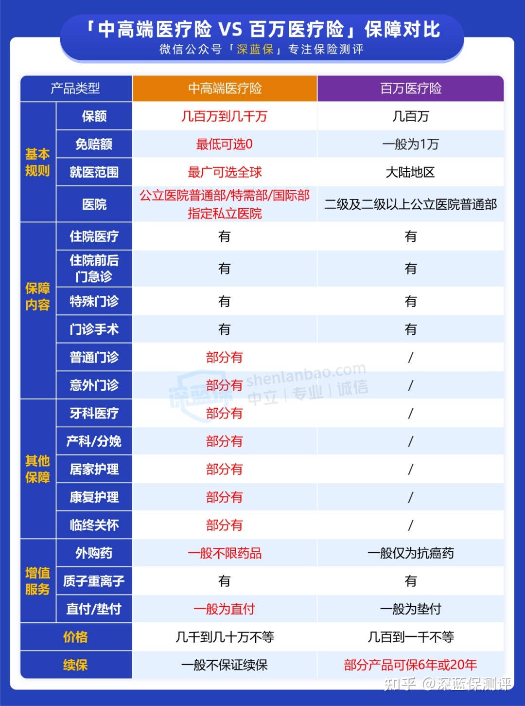在保障方面,两者的差距也比较大。为了方便大家了解,我们将中高端医疗险与市面上热销百万医疗险的常见保障形态进行对比,并整理成了图片: