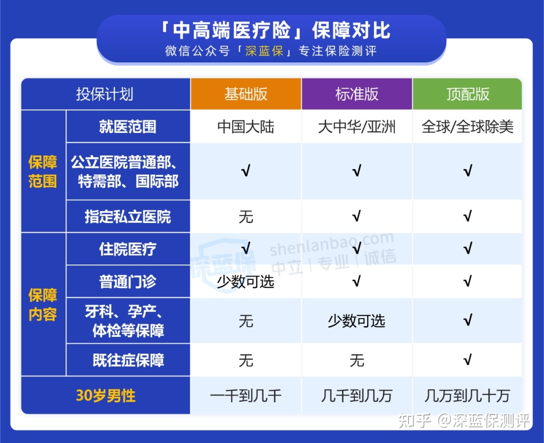 中高端医疗险,产品价格从几千到几十万,差价巨大,我们简单将其分成三个版本,来看看应该如何选择: