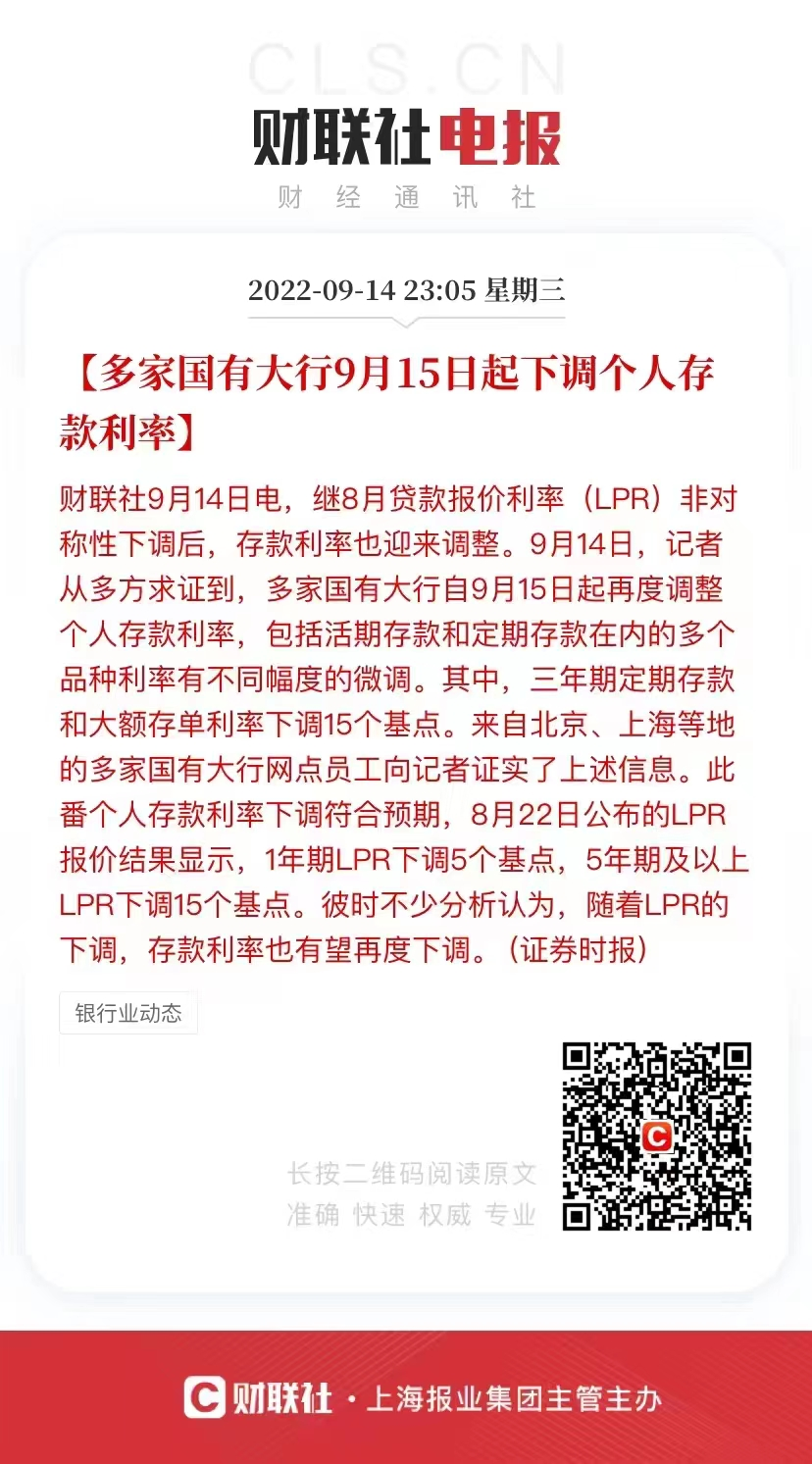 而就在 9 月 15 号,工农中建四大行甚至又宣布:再次下调存款利率。