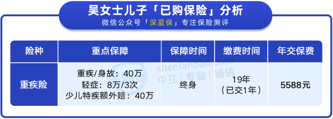 目前,吴女士只给孩子配了重疾险,所以她想趁着此次咨询,补齐孩子的保障。