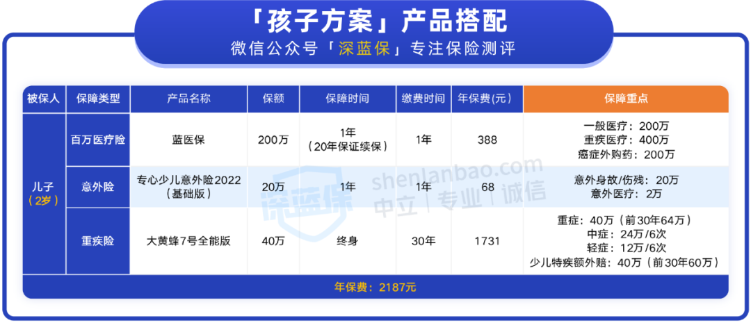 这样配下来,孩子的保障就比较充足了,一年保费也才 2187 元,大大减轻了吴女士家的保费压力。
