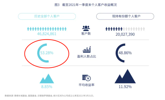 截至 2021 年一季度末,基民平均年化收益率为 8.85%,而盈利人数占比为 53.28%,换言之:有近半的基民不赚钱甚至亏本。