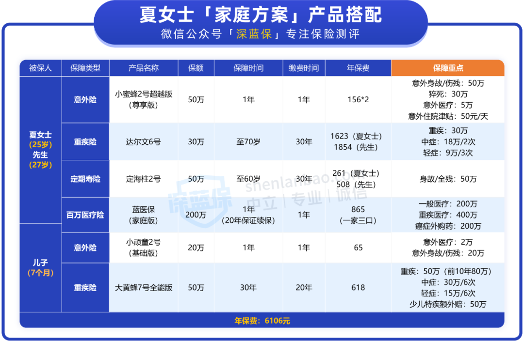 整体配下来,一家人的这套方案共计花费 6106 元,符合夏女士一家现阶段的需求。