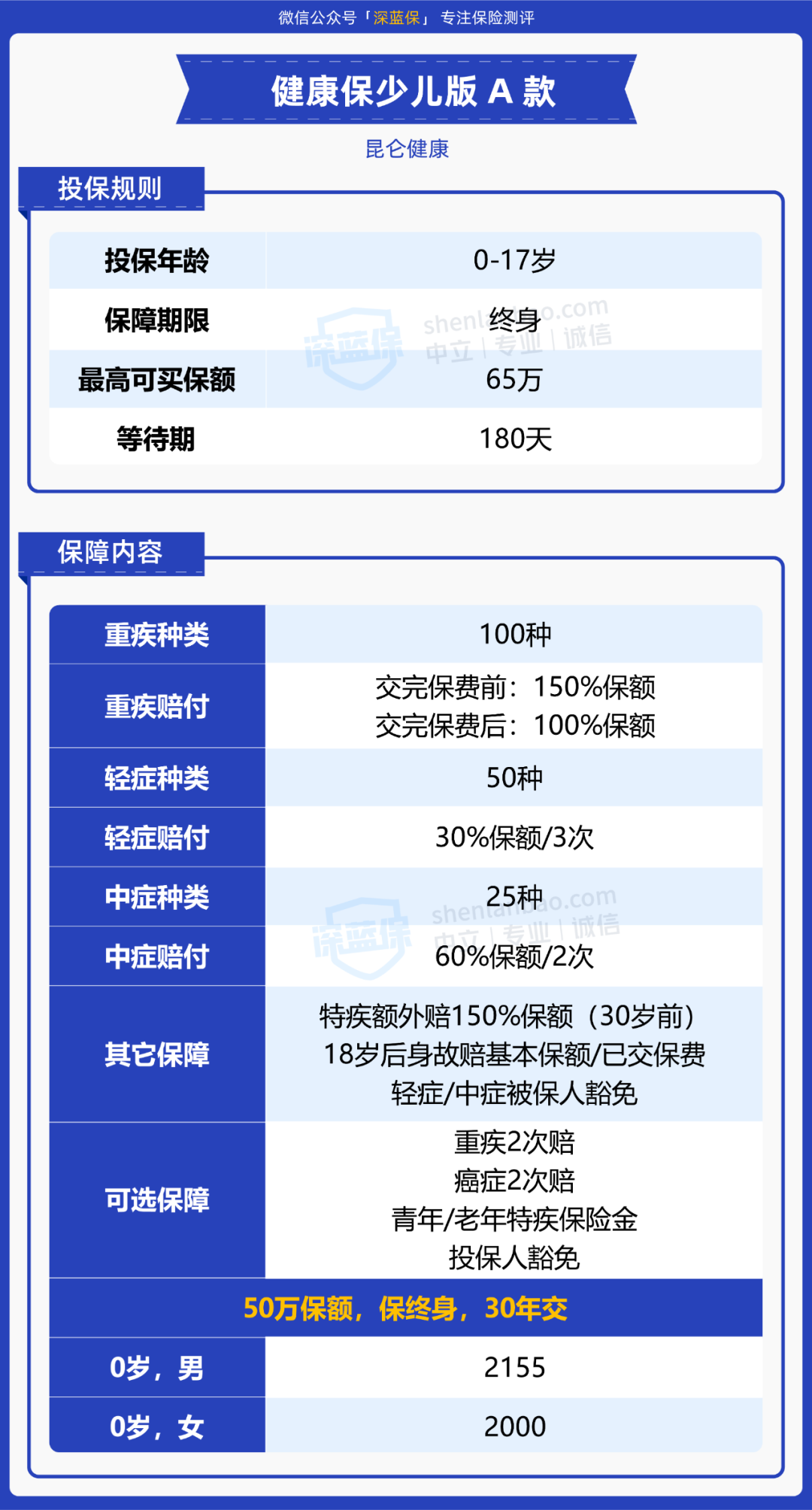 健康保少儿版A款是一款保终身的产品,涵盖基础的重疾、中症和轻症保障。买50万保额,分30年交,在前30年确诊重疾最高能赔75万。