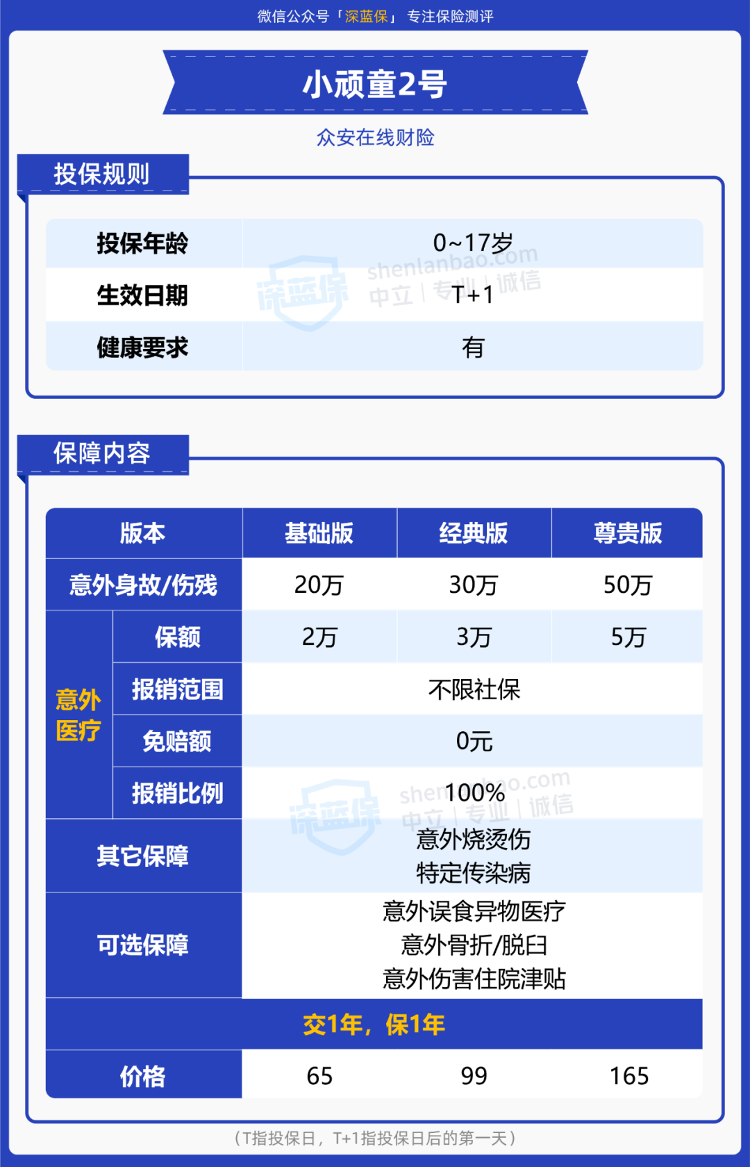 小顽童2号整体保障很不错,意外身故或伤残保障最高有50万保额;意外医疗没有免赔额,社保内外的医疗费都能100%报销。
