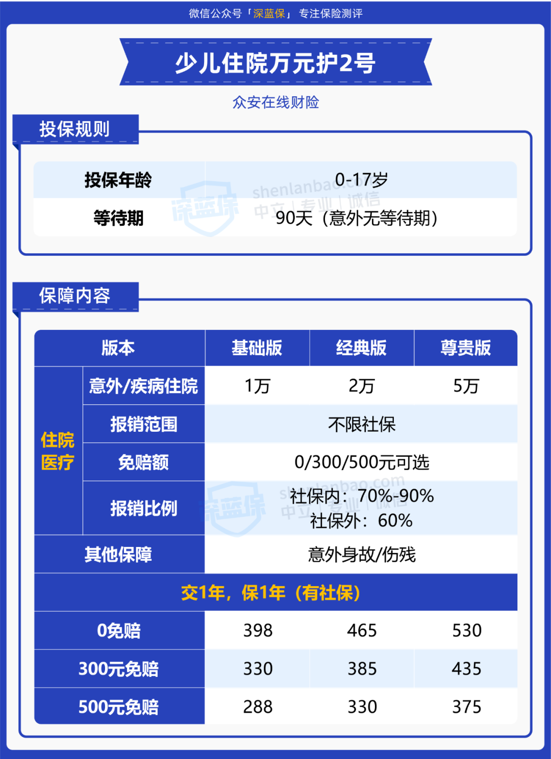 少儿住院万元护2号是一款小额医疗险,可以报销意外和疾病住院的费用,不限社保报销,社保外费用最高报销60%。