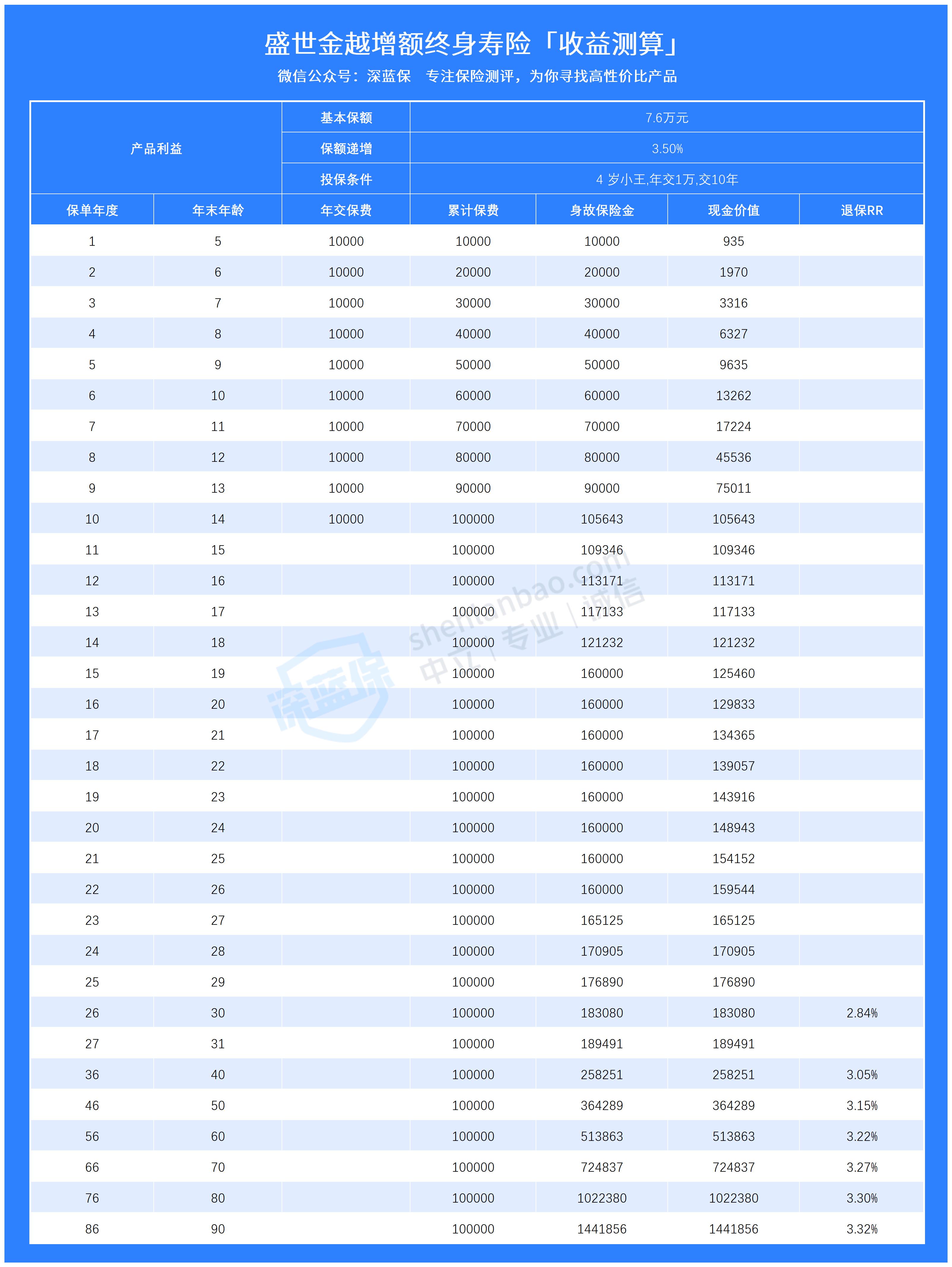 以4岁小王,年交1万,交10年,共投入10万为例,他的收益如下: