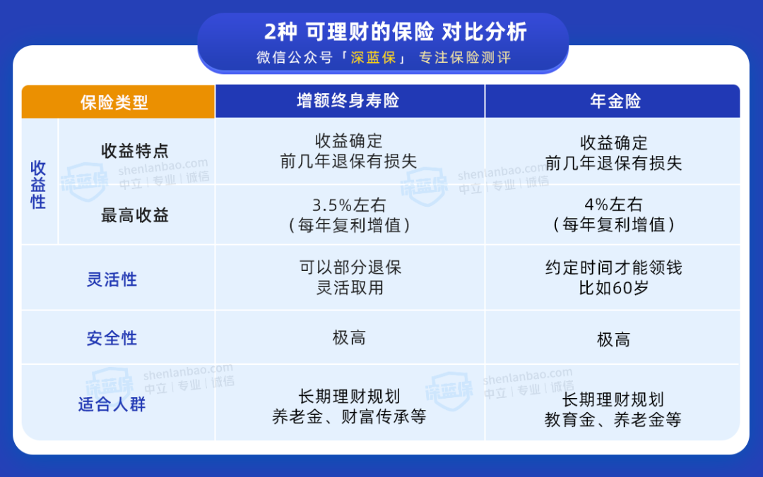 说起理财型保险,之前有看过深蓝君文章的伙伴应该是有一些了解的。理财型保险中,年金险和增额终身寿险是大家问的比较多的,也是比较热门的选手。