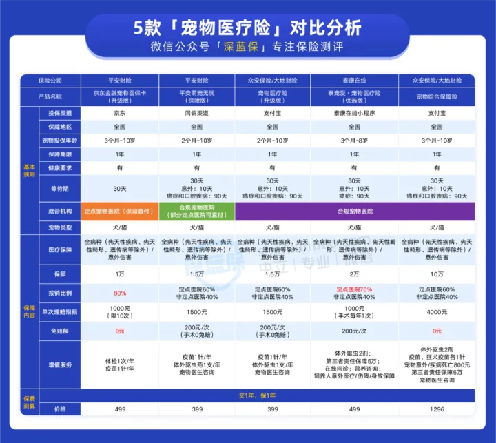 如果要报销条件好:「京东金融宠物医疗卡」值得考虑 ,每次可以报销 80% 费用,而且 0 免赔,比市面上大部分产品有优势。同时它还支持定点医院直付报销,非常方便。