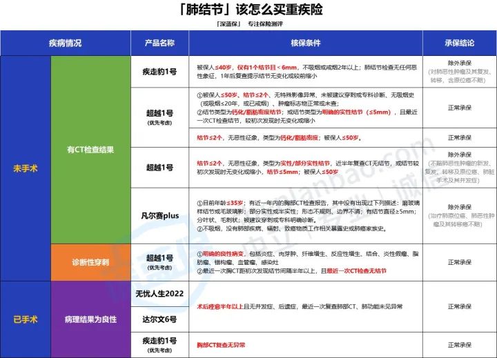 我将市面上对肺结节核保条件较友好的几款优秀重疾险产品总结成一张表格,有需要的朋友可以将下图保存起来: