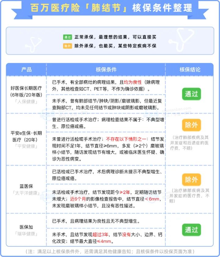 因为投保百万医疗险时,针对肺结节的核保条件也比较复杂,我们整理了部分热门产品的核保条件,需要的朋友可以参考下面的表格: