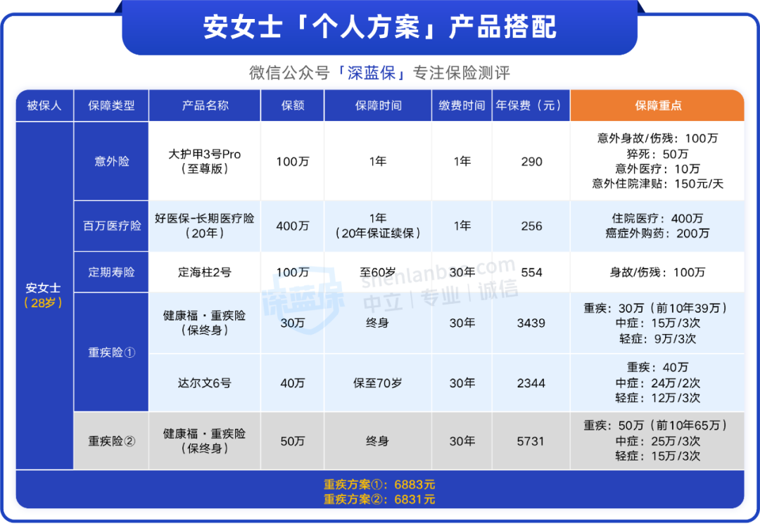 针对安女士的情况,我们为她配齐了四大险种,其中重疾险有两种搭配思路,安女士选择了第一种,我们一起来看下: