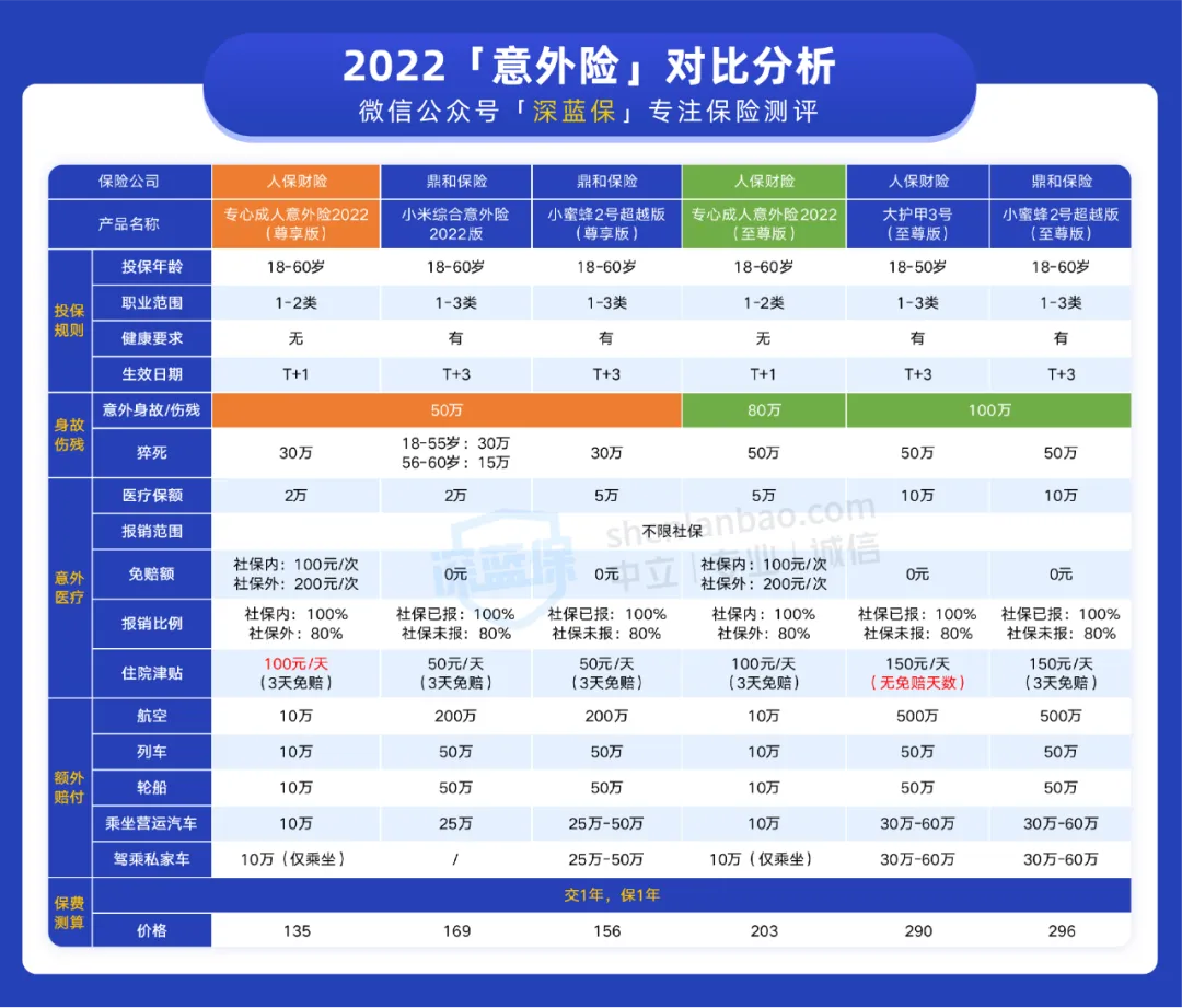我们挑选了几款不错的意外险来和专心成人意外险 2022进行对比,下面来看看: