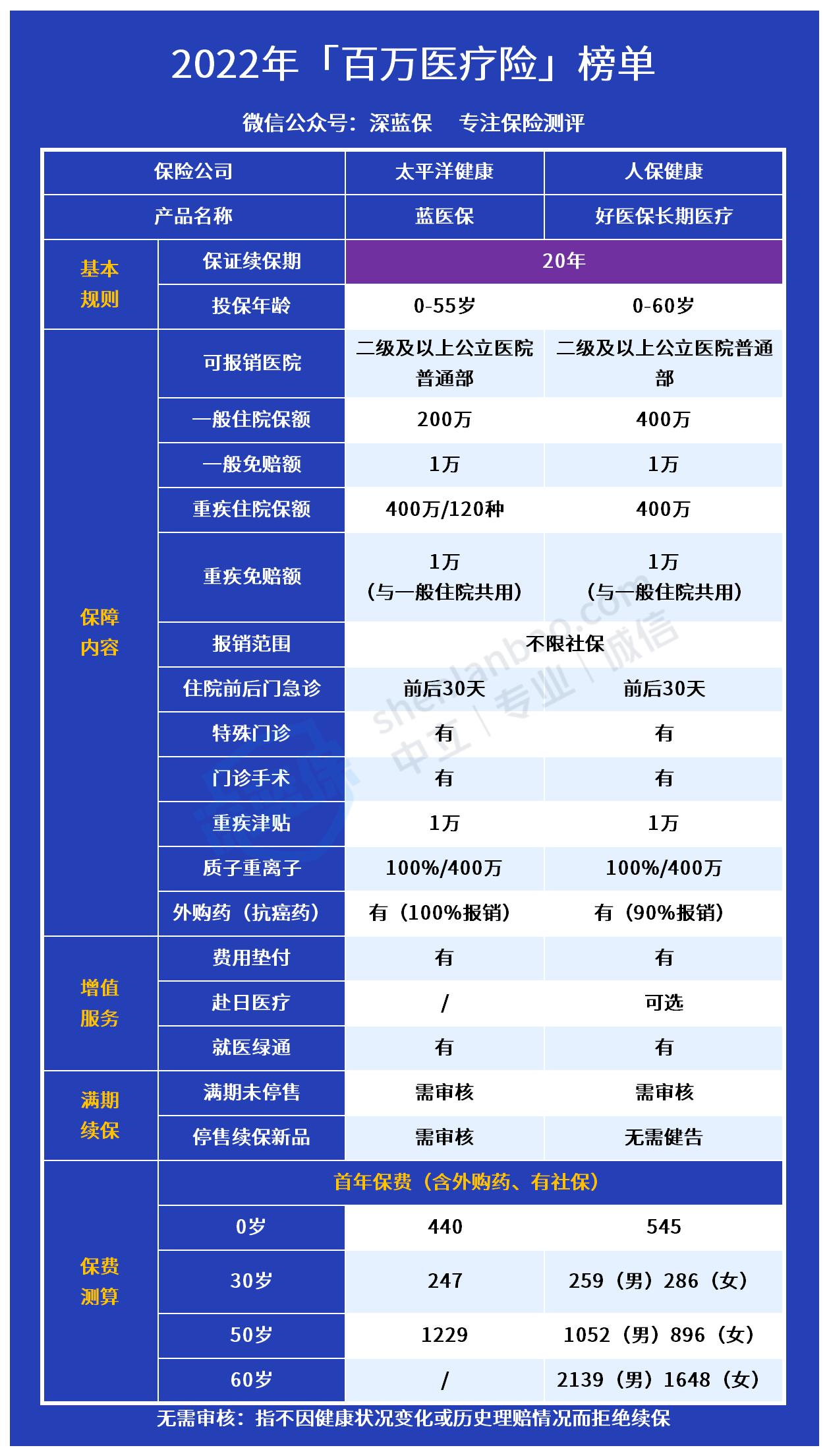 从上表可以看到,投保2款产品,0岁和30岁投保,蓝医保的价格要低一点,而50岁投保,好医保长期医疗险的价格要高点。