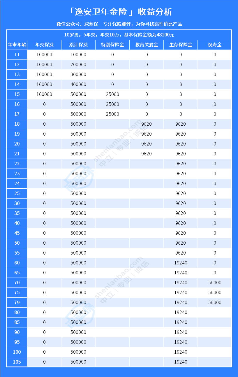 我们以“10岁男生,交10万,交5年”为例,来看看逸安卫年金险的整体收益情况:快返年金天花板!逸安卫年金险保障如何收益高不高?