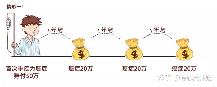如果第一次重疾不是癌症,第二次重疾是癌症,那么要等到第三次重疾是癌症(癌症复发)才能赔。