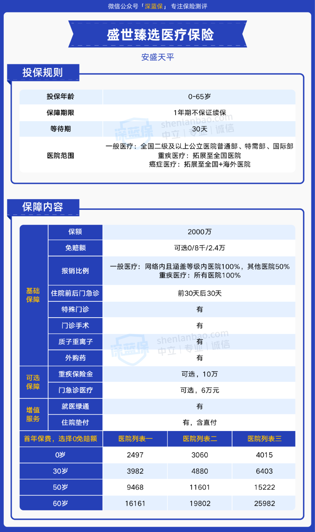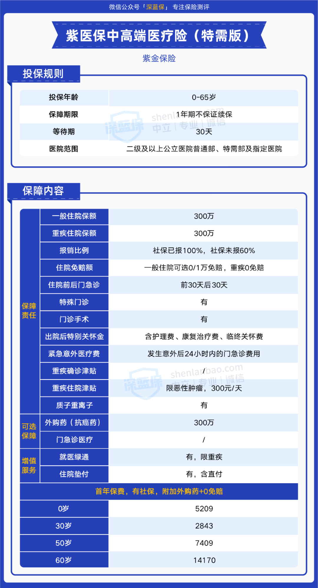 而价格上,以有社保身份投保,选择0免赔额,0岁首年保费是2379元,30岁是1872元,性价比较高。