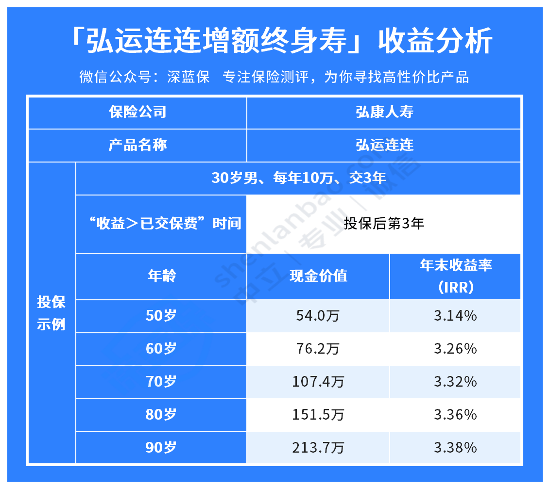 不过对于一款增额终身寿险来说,最重要的无疑就是其收益了,这里深蓝君以“30岁男性,3年交,每年交10万”为例,测算了弘运连连的收益。