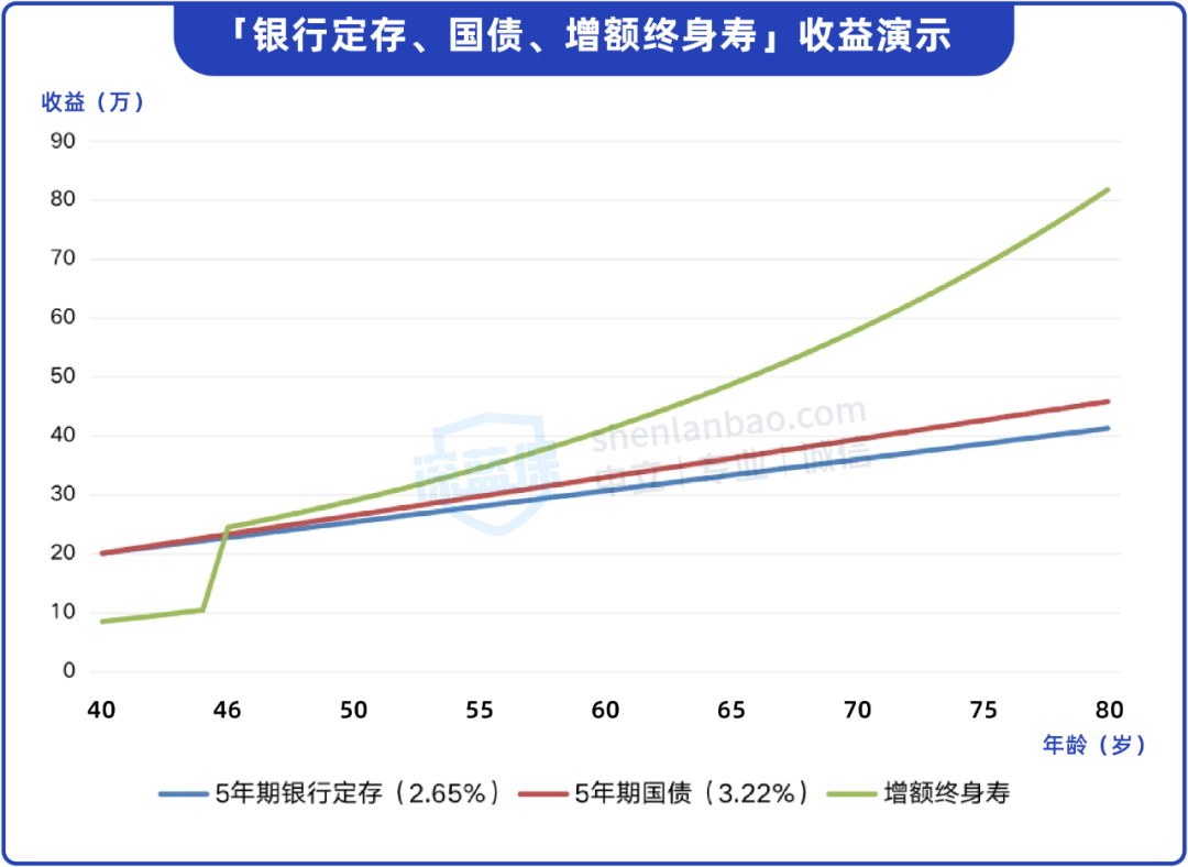 可以看出,在前5年国债以及5年期的银行定存收益更具优势,但是从第6年开始,增额终身寿险的收益会更高一些,并且随着时间的拉长差距会越来越大。
