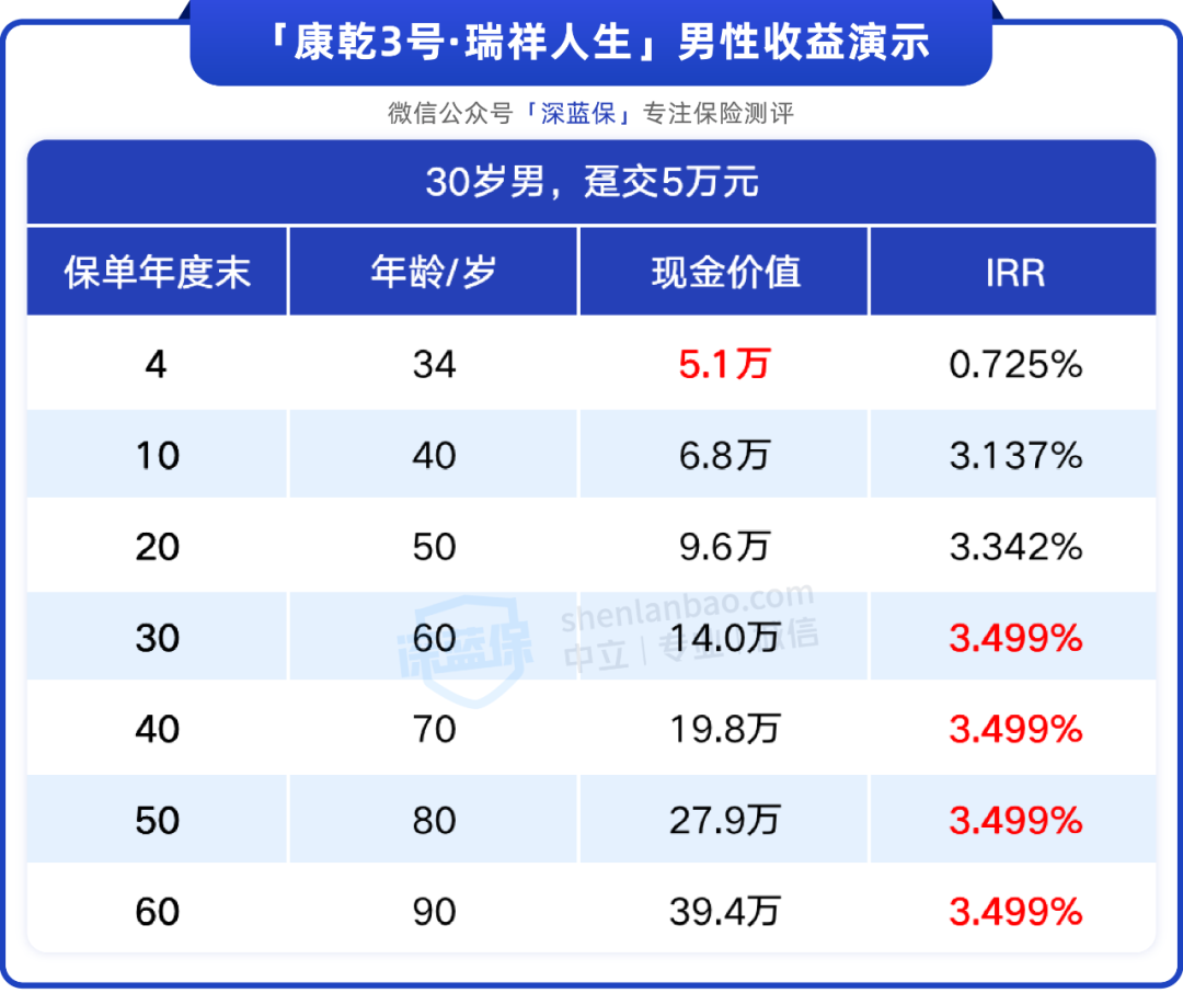到了第4年的时候,保单的现金价值就超过了已支付保费,现金价值的增长速是很快的,并且到了60岁的时候,IRR就能达到3.499%,收益已经是非常高的了。