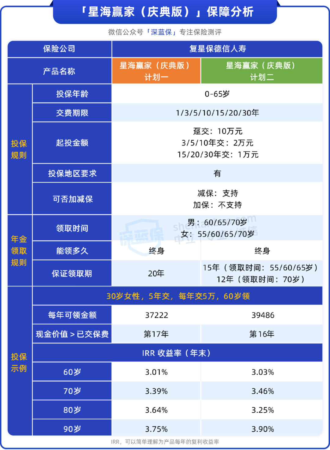 可以看到,星海赢家庆典版有两个版本可选,并且最高投保年龄为65岁,最长交费期限为30年,预算有限的朋友可以通过拉长交费期限的方式,来缓解部分保费压力。