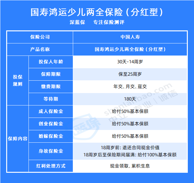 中国人寿教育基金保险产品较多,由于文章篇幅有限,深蓝君就不一一赘述了,我们就挑一个代表,那就是国寿鸿运少儿两全保险(分红型),一起来看看中国人寿教育基金保险,值得买吗?