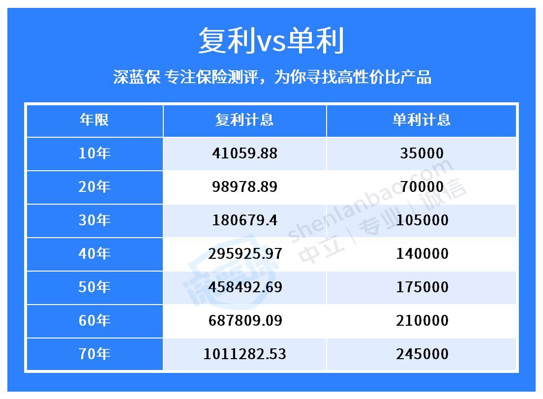 可以看出,如果是复利计息的话,在第10年的时候保单的现金价值就达到4万元,相比单利计息要多出5000元。