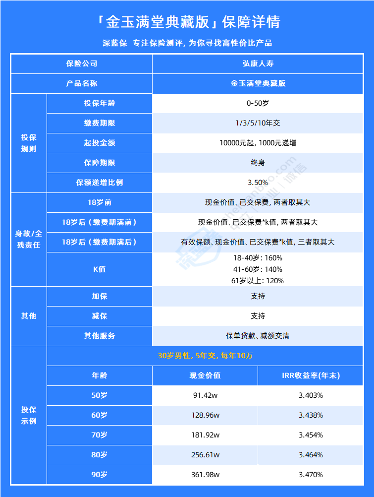 下面深蓝君以金玉满堂典藏版增额终身寿险为例,给大家讲讲增额终身寿险的收益和灵活性: