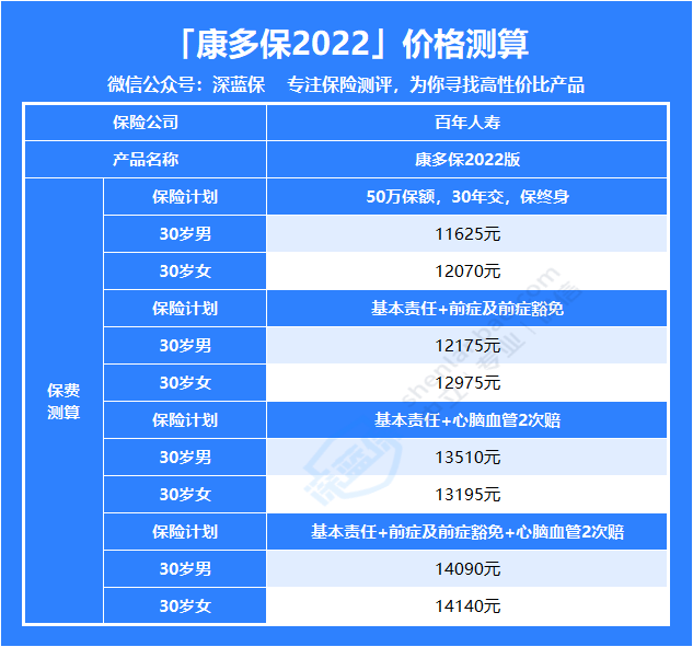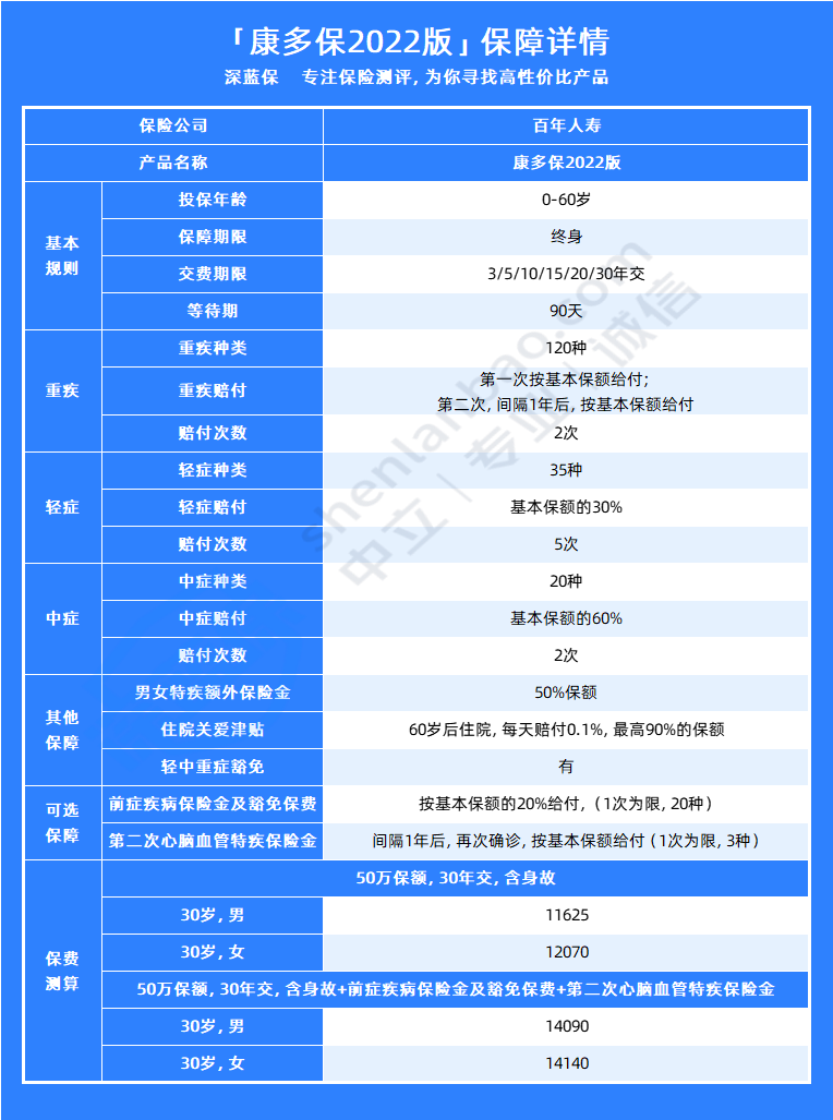 关于不分组多次赔付的重疾险,之前深蓝君为大家重点介绍过阿波罗2号(珍藏版),而百年人寿保险公司又推出一款产品——康多保2022版。