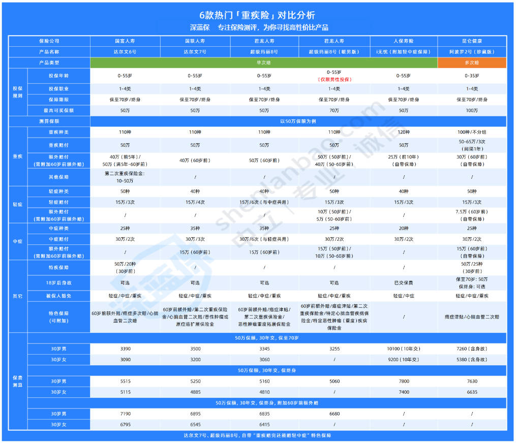 深蓝君测评了数十款不同保险公司的重疾险产品,并从中筛出了6款性价比不错的重疾险,供大家参考: