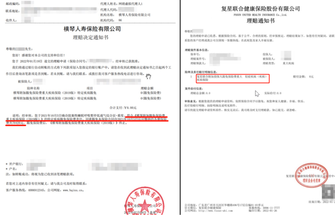 最终,在理赔团队的协助下,刘先生买的两份重疾险,一份成功理赔,一份给出了拒赔通知。