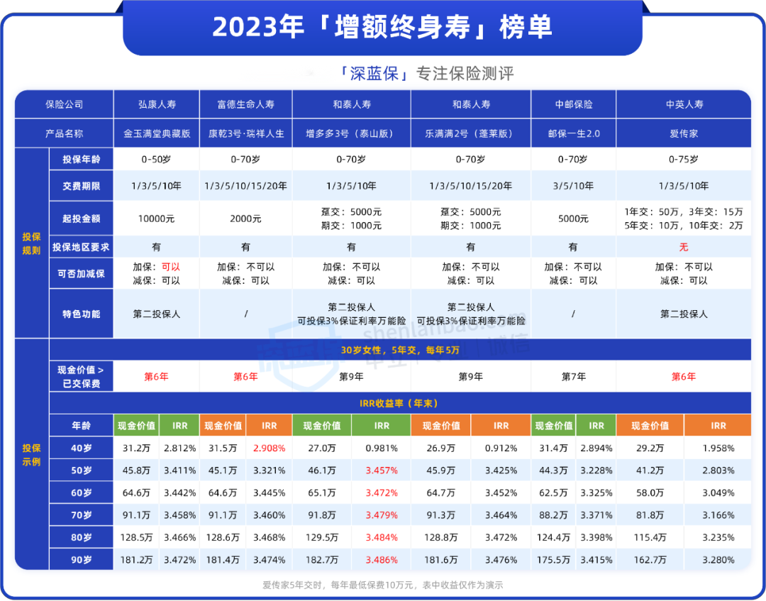 深蓝君这次为大家筛选出了6款表现优秀的增额终身寿险,并且以“30岁女,每年交5万,交5年”为投保条件测算了具体的产品收益,供大家参考: