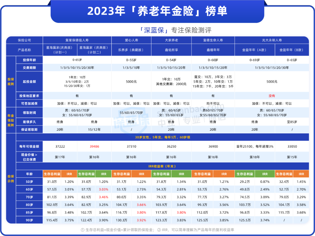 在养老年金方面,深蓝君为大家筛选出了5款优秀的产品,供大家参考,其中产品的收益是以“30岁女,每年交5万,交5年”为条件进行的测算。