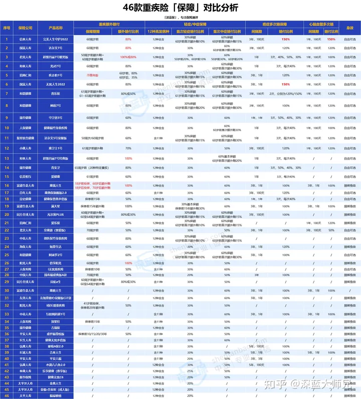 46款重疾险的保障情况都汇总在上表中了,深蓝君简单做个总结:
