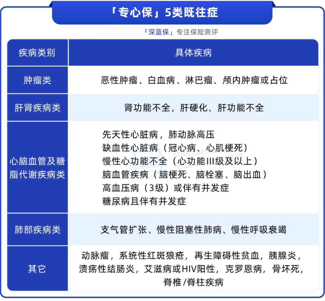 专心保约定的既往症有下面这5类,具体的疾病跟其他惠民保也差不多,主要是癌症、心脏疾病这些: