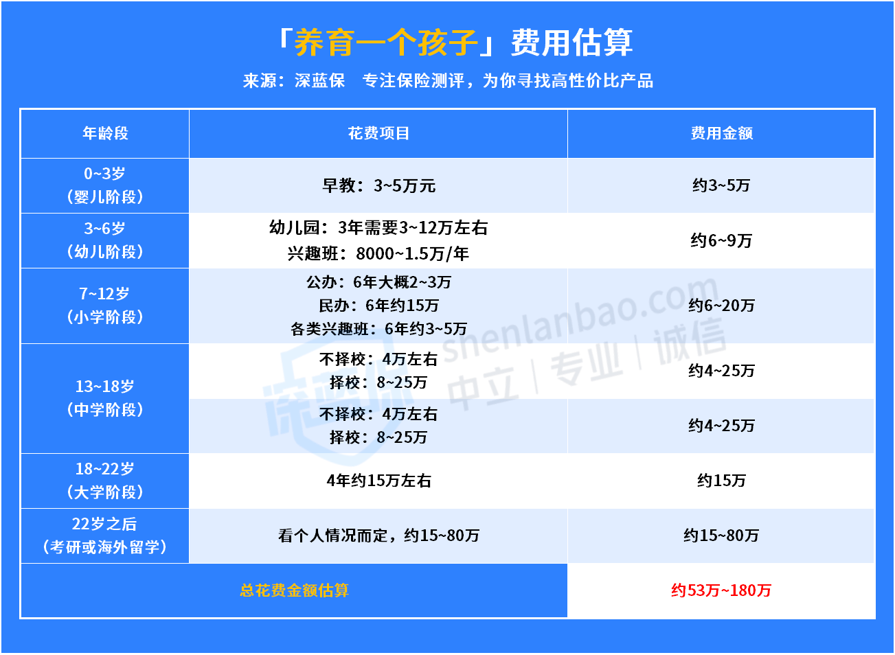 从孩子出生起,到早教、幼儿园、义务教育阶段、高中大学甚至出国留学,这一整个教育阶段又需要花多少钱呢?